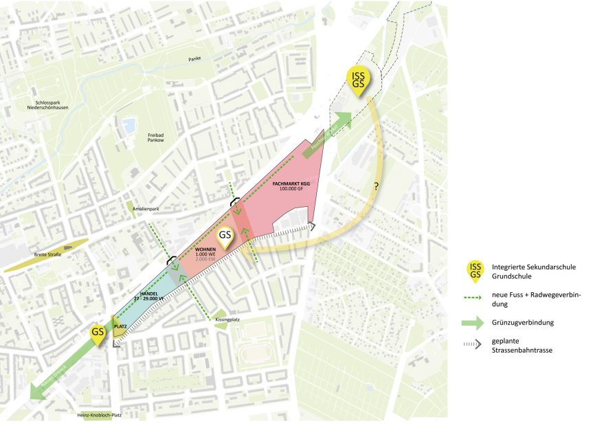 Kooperatives Verfahren zur Leitbildentwicklung für die ca. 26 ha große Fläche des ehemaligen Rangierbahnhofs Pankow zu einem innerstädtischen Wohnquartier mit ca. 1.200 WE, Schulstandort und Verkaufsflächen für Einzelhandel und Fachmärkte sowie der Freihaltung einer Tram – Trasse.